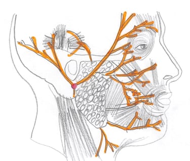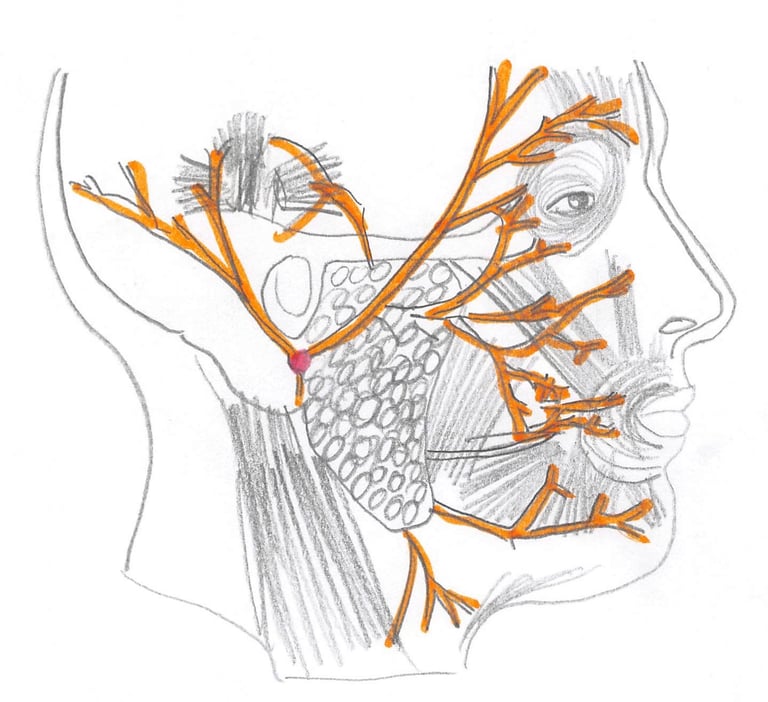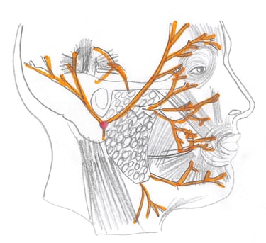 The brainstem is the first of two places where the virus is thought to gather and be stored in its latent stage. Its main nerve travels out of the skull and splits into three smaller nerves at a ganglion (which is like a relay point) just behind the ear. This happens to be at the acupuncture point SanJiao-17. This ganglion is thought to be a second place where the virus can gather and go latent. The three branches then innervate the side of the face and reach the muscles around the eye, nose, and mouth, as well as the tear and salivary glands, and back of the tongue.