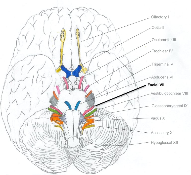 Temporary facial paralysis on one side of the face is caused by impairment of the Facial Nerve. This is the seventh cranial nerve. It originates inside the skull, on the underside of the brain, like the other cranial nerves. This area is called the brainstem, it's between the brain and spinal cord. Thus, it's in the back of skull and on the bottom of the skull, and is part of the Central Nervous System.